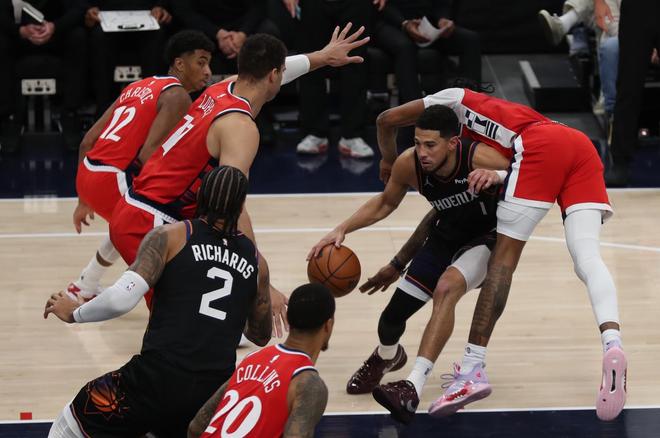 太阳队的布克得到21分、10个篮板和9次助攻,威廉姆斯得到19分和6个篮板,布鲁克斯得到16分,阿伦得到14分,吉莱斯皮得到13分、6个篮板和4次助攻,奥尼尔得到12分、7个篮板和5次助攻。快船队的祖巴茨得到21分、15个篮板和4次助攻,科林斯得到19分和4个篮板,哈登得到13分和13次助攻,比尔得到12分,巴图姆得到9分。